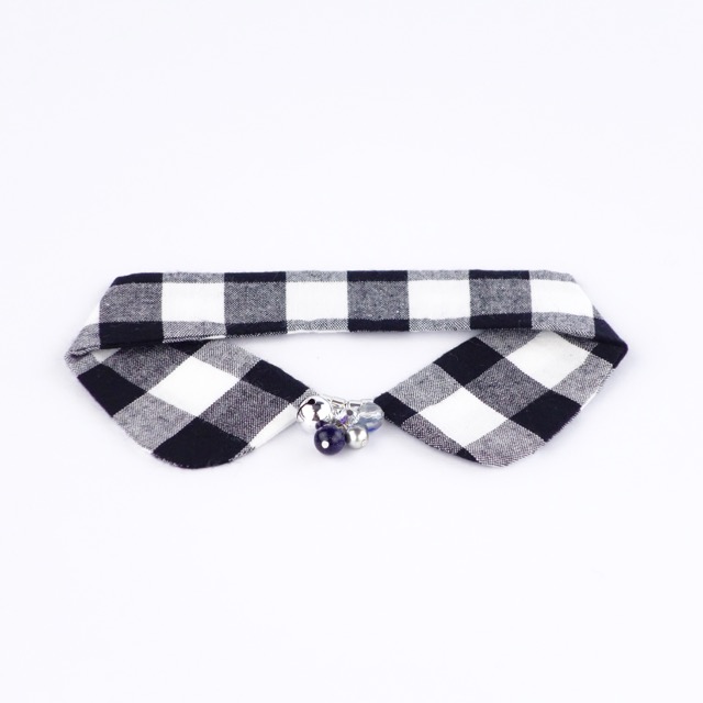 Fashioned from a monochrome checked fabric and finished with a cluster of tiny blue-and-silver charms, this classy decorative collar will always be in style!