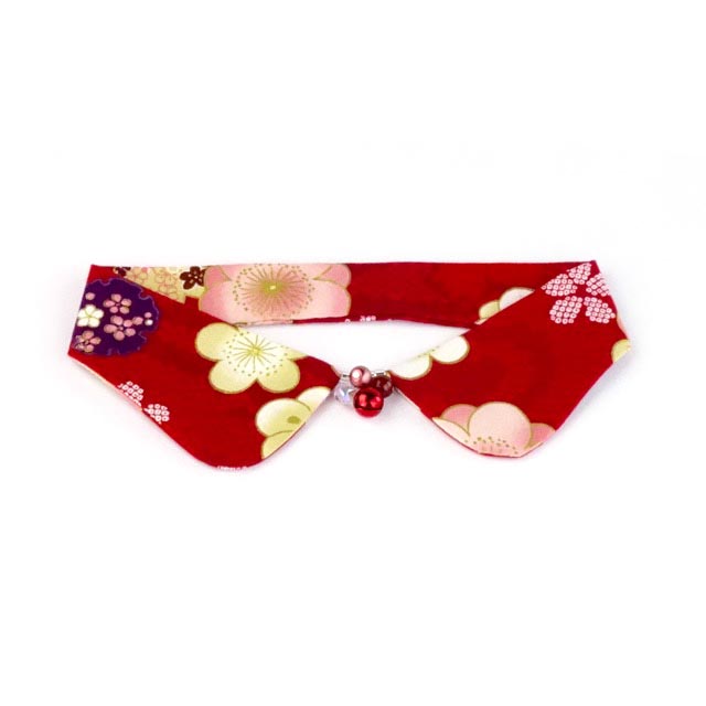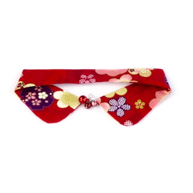 Sakuras are scattered across a rich red background, and a tiny bunch of complementing charms finishes off this beautiful decorative collar.
