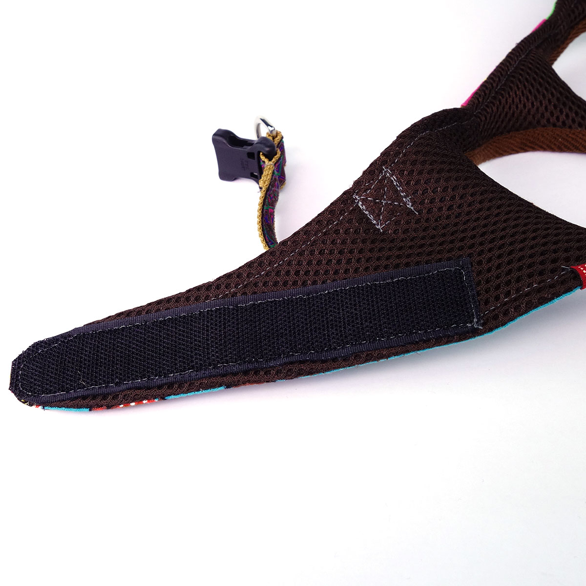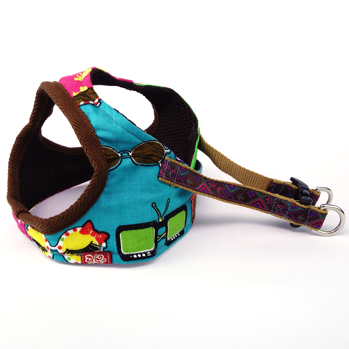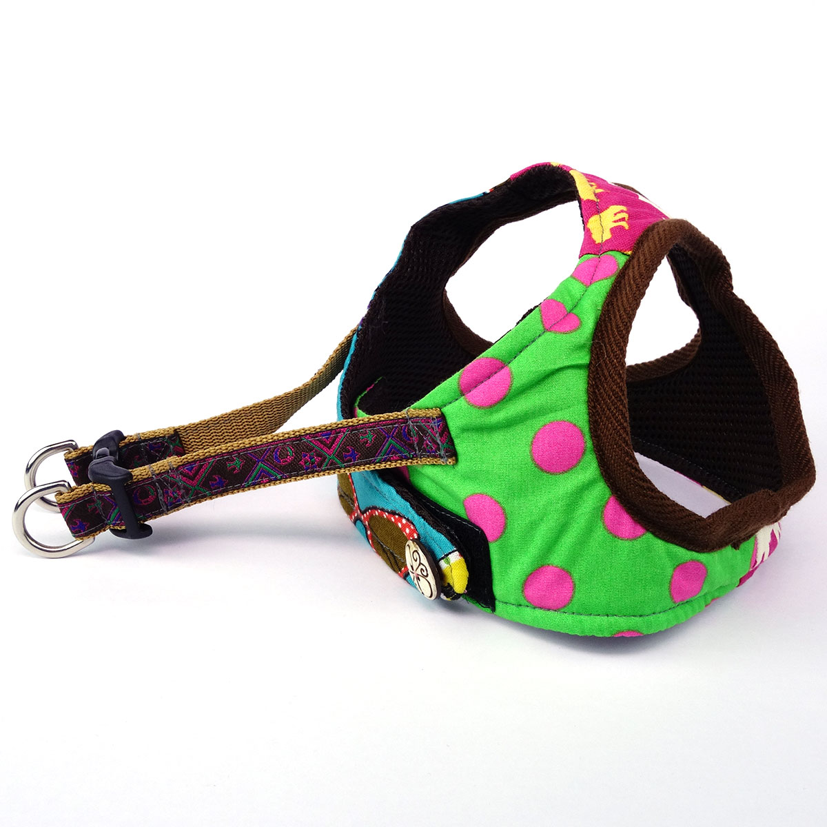 The cushioned breathable polyester mesh interior ensures your dog’s ultimate comfort, while the outer patchwork of 3 different colourful 100% cotton prints allows you and doggie to walk in style.